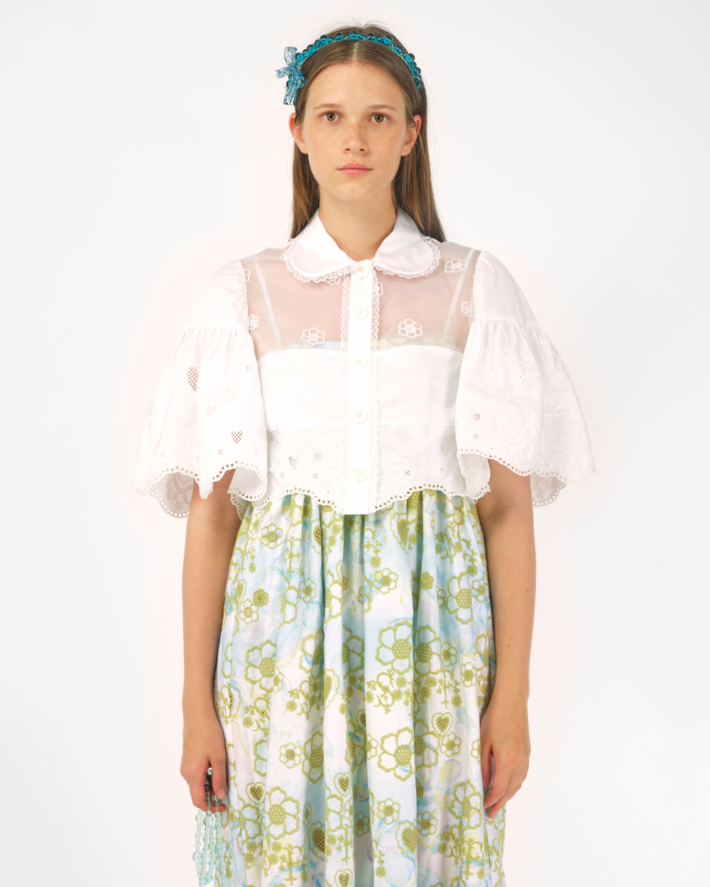 SUSAN FANG Broderie Anglaise Cropped Mini Shirt is waist-length relaxed shirt with ruffle sleeves, curved hems and front button opening. It is crafted from our floral broderie anglaise fabric in premium cotton and organza.