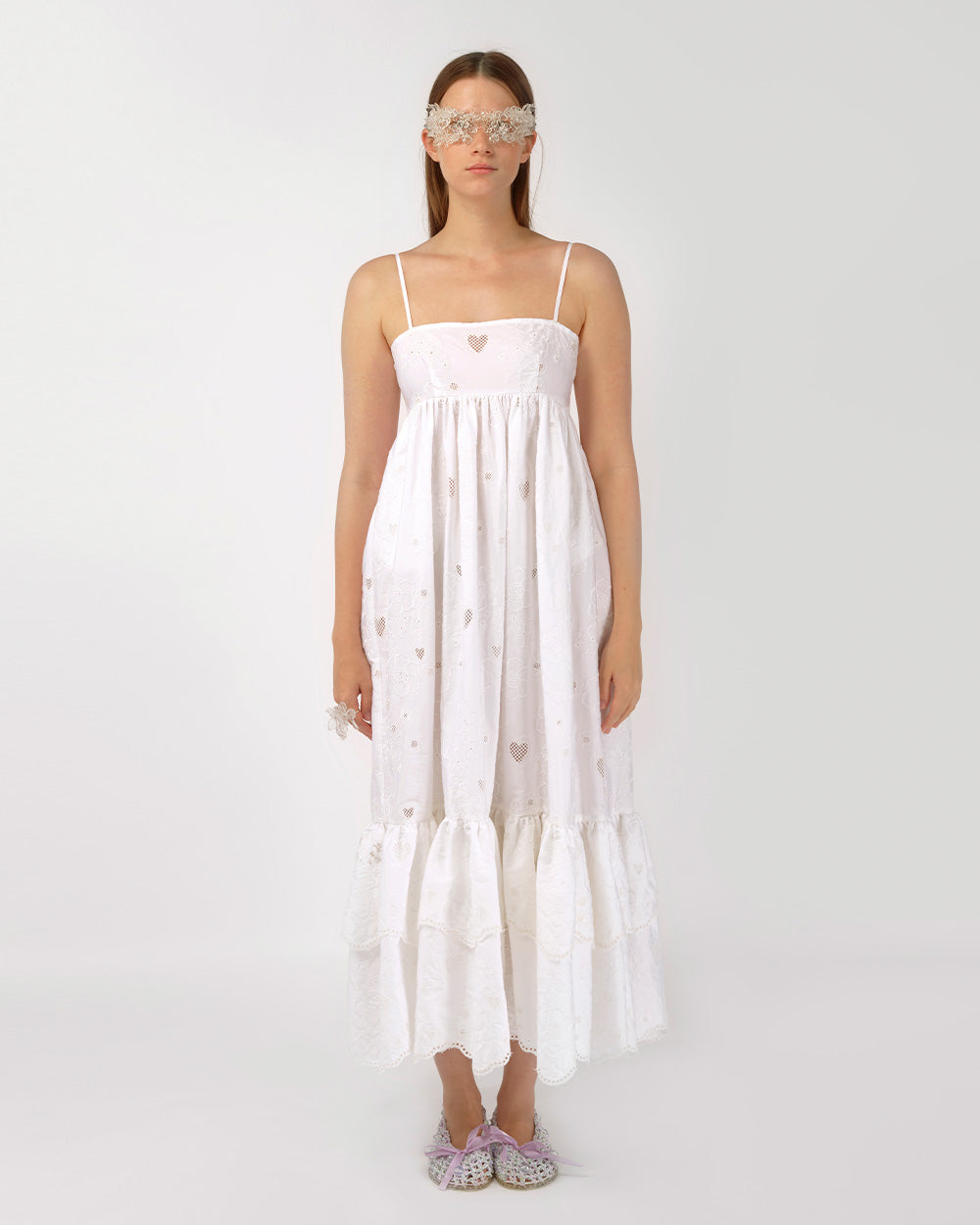 Susan Fang Broderie Anglaise Strap Dress is an elegant ankle-length sleeveless dress crafted from flower broderie anglaise fabrics. It features delicate thin shoulder straps and a voluminous gathered hem.