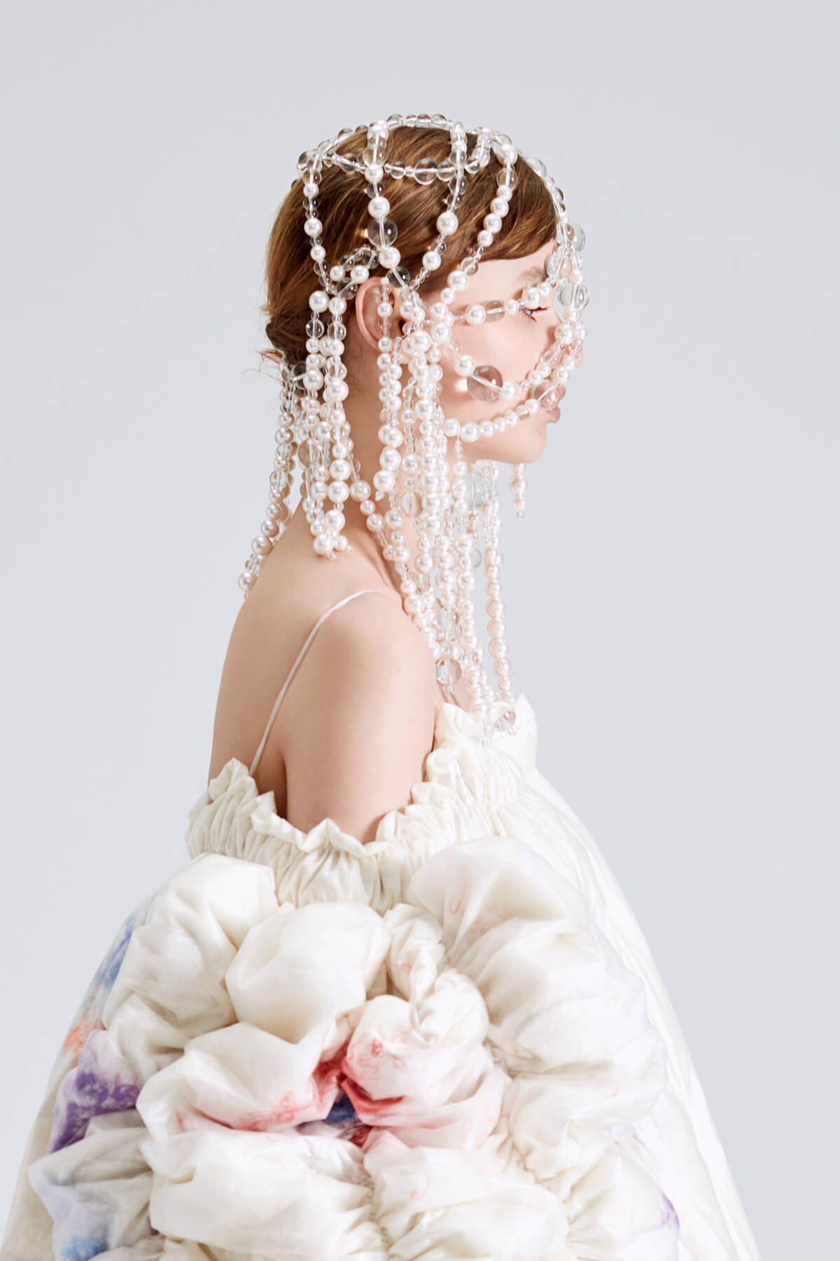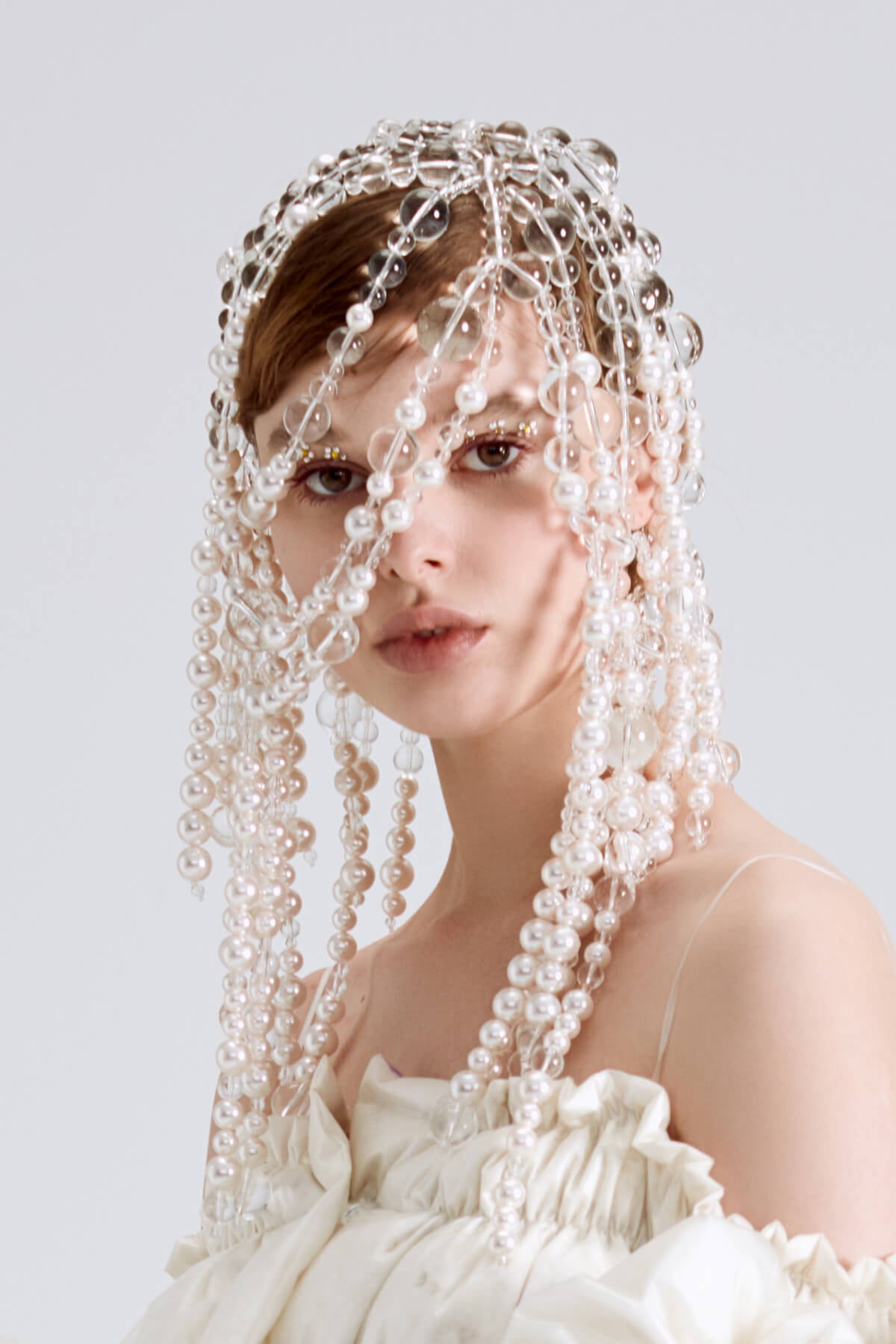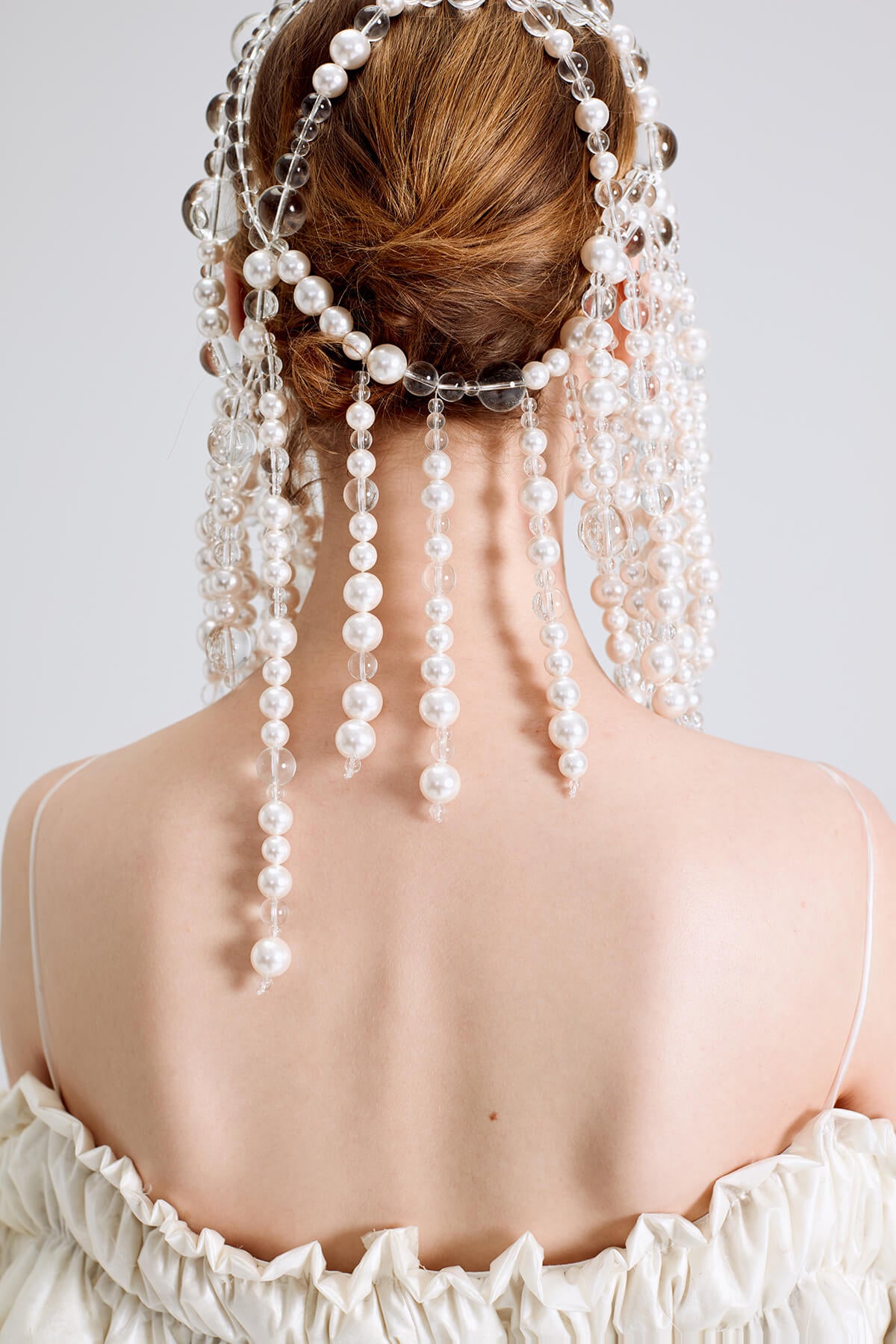 Our headpiece mixed with Bubble beads and Pearl beads create our headpiece that sits comfortably on the head. The dramatic tassels of beads and pearls reminiscent of locks of hair.