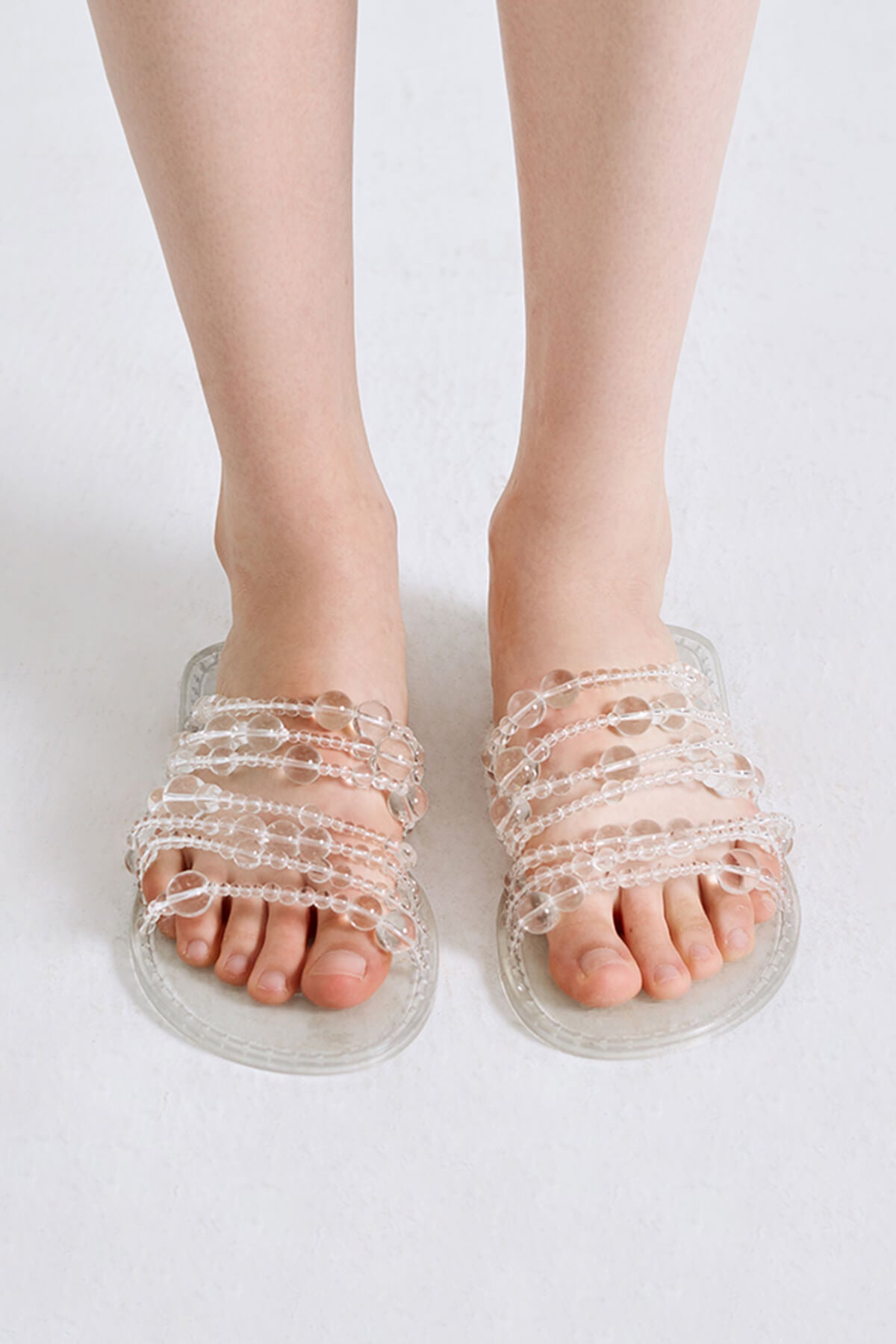 Bubble Spiral Sandal is made of multiple lengths of bubble beads that cross over the feet imitating a spiral motion.