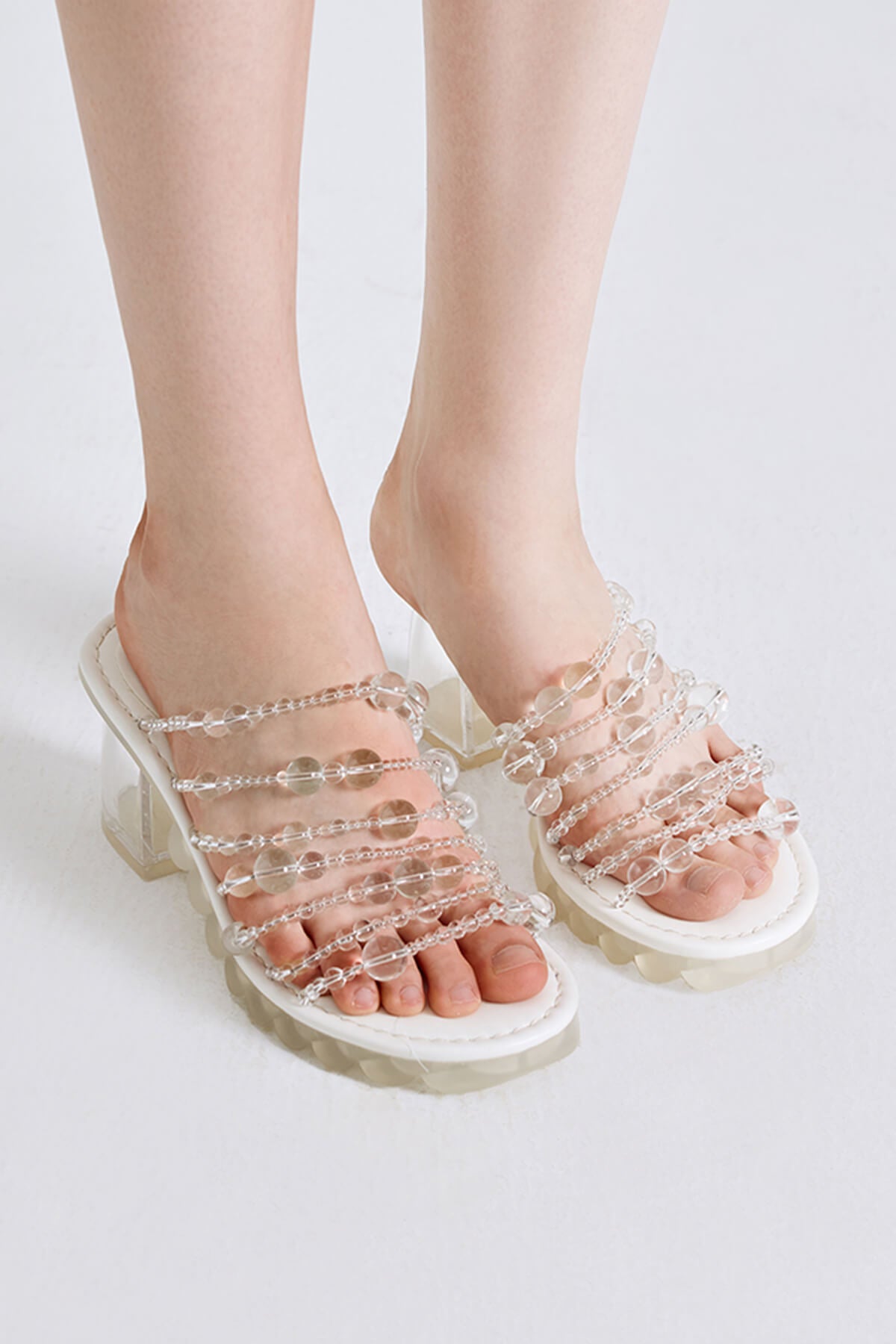 Our new heel design features a transparent heel and rubber scallop-shaped sole. We use a mixture of Bubble bead sizes to create the multiple straps that go across the foot for security and ease.