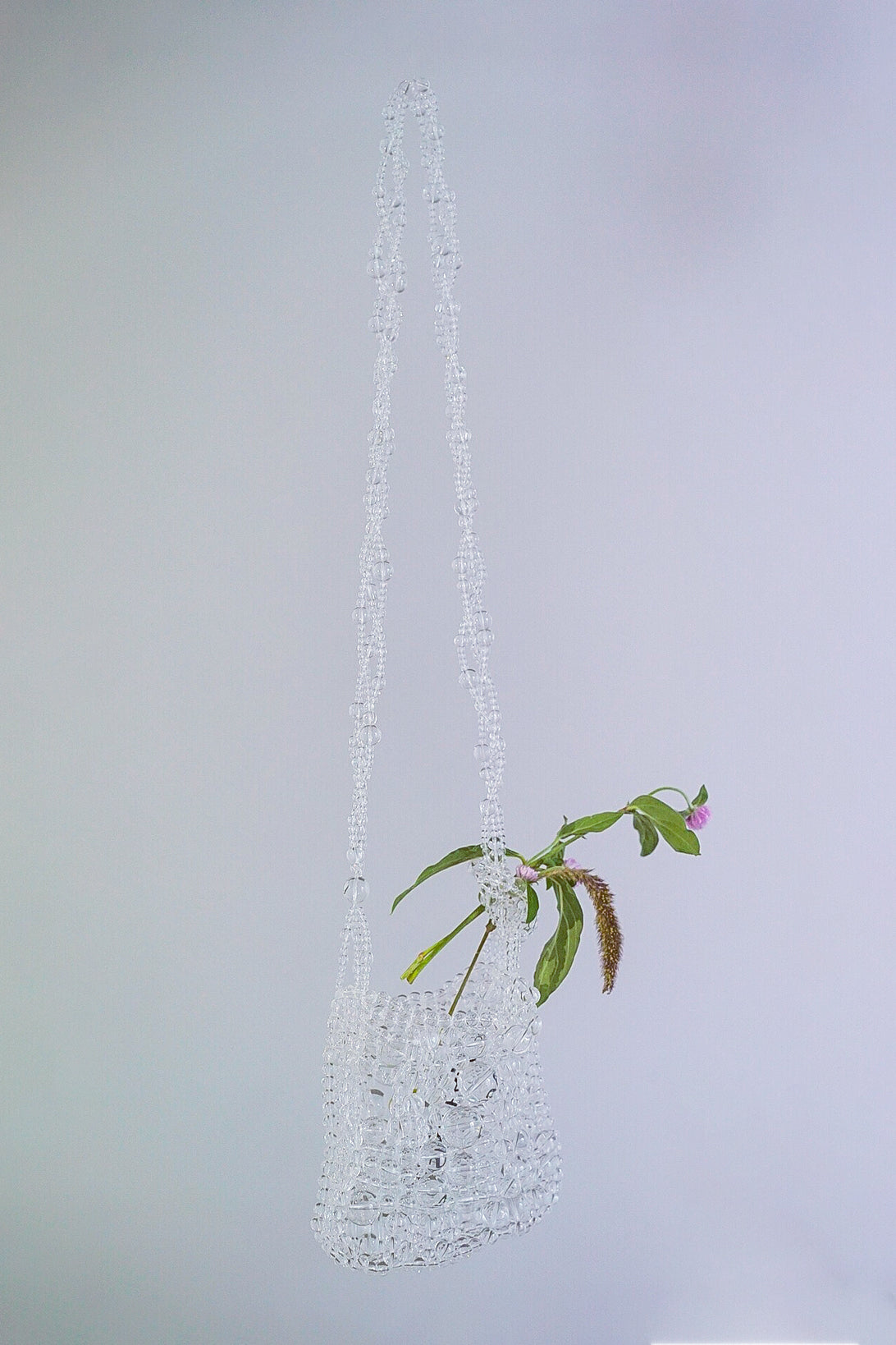 Inspired by traditional Chinese bamboo weaving, the crystal bubble beads use technique of intricate and tight weaving to create an evaporating bubble version of a bamboo bag.