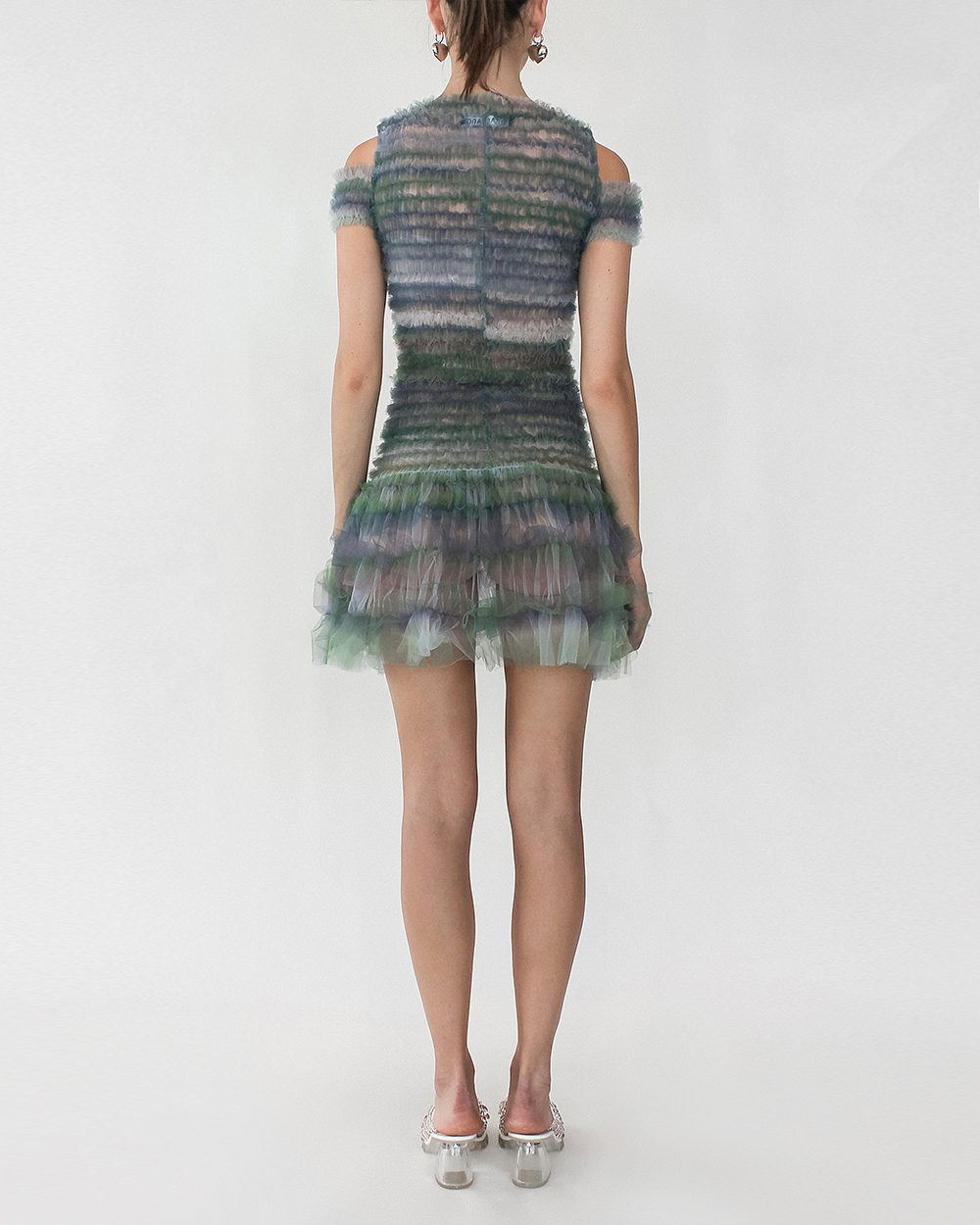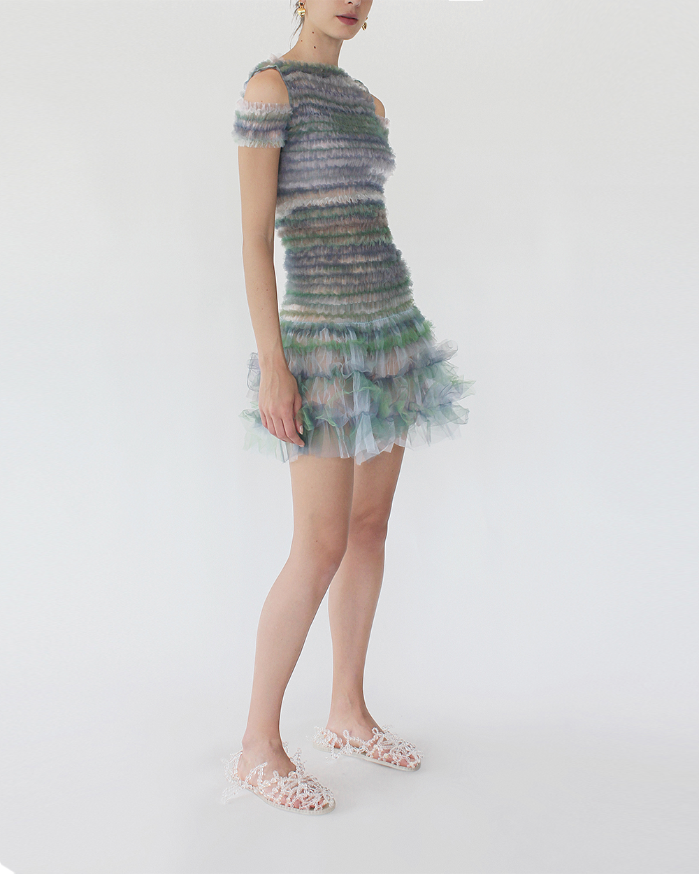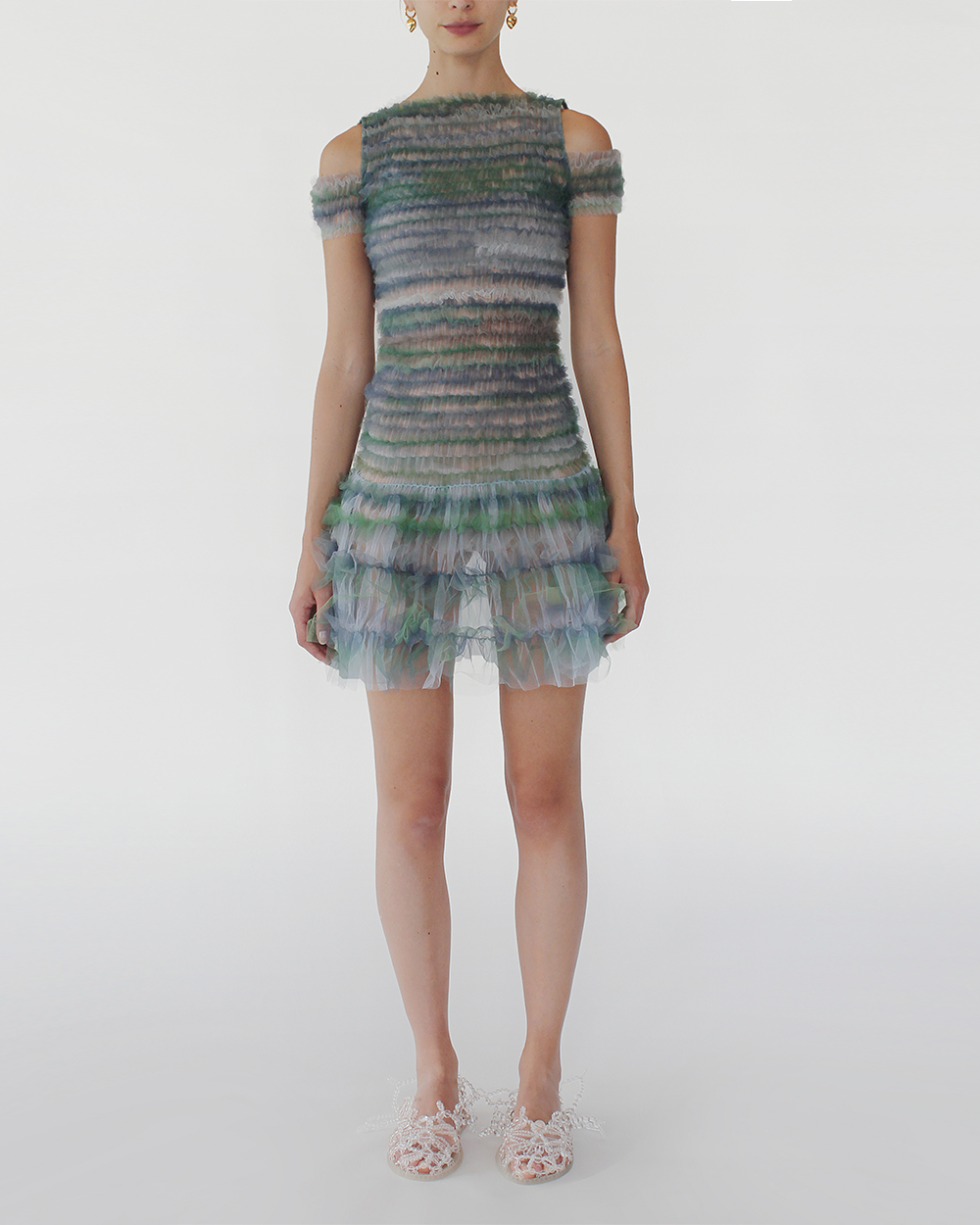 This dress features a fun off shoulder detailing while co-operating our signature shirred bodice with tulle detailing across the dress. The dress also features a slight flare skirt design for a fun silhouette.
