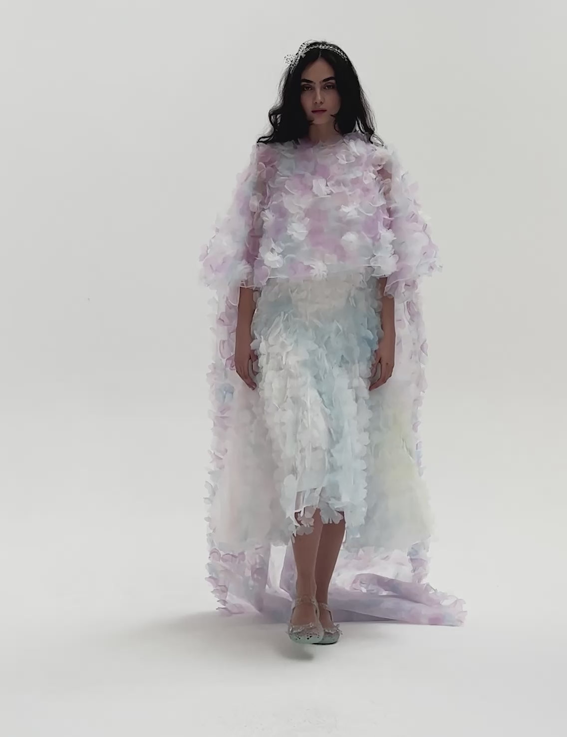 SUSAN FANG Laser-cut Butterfly Maxi Cape features intricately laser-cut floral petals that subtly evoke the form of butterflies. Designed with a shorter front and a flowing train, the piece creates a dramatic, sculptural silhouette. Both striking and refined, it serves as a statement layer for bridal occasions or evening wear.