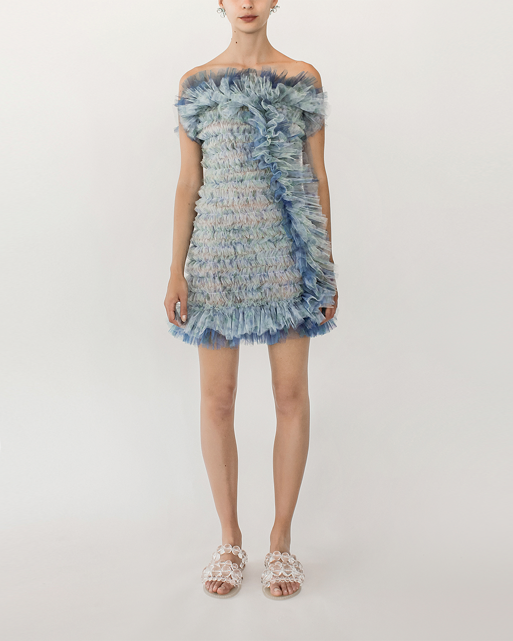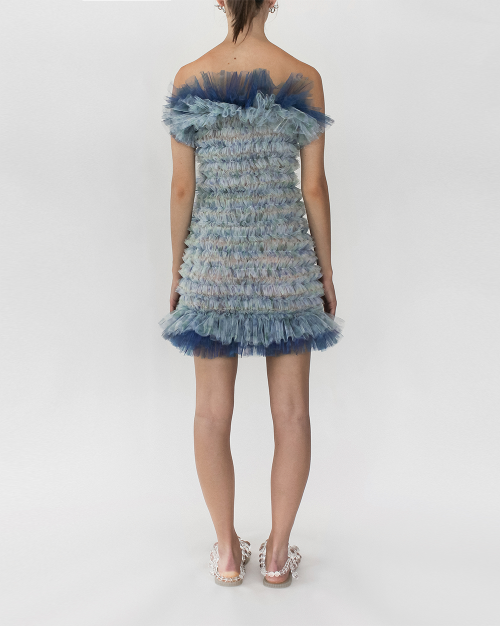 Designed with dramatic flow of frill across the neckline, front bodice to the hem of the dress. In addition the whole dress is shirred for a fitted yet flexible fitting. Perfect as a special evening dress or as a cocktail dress.