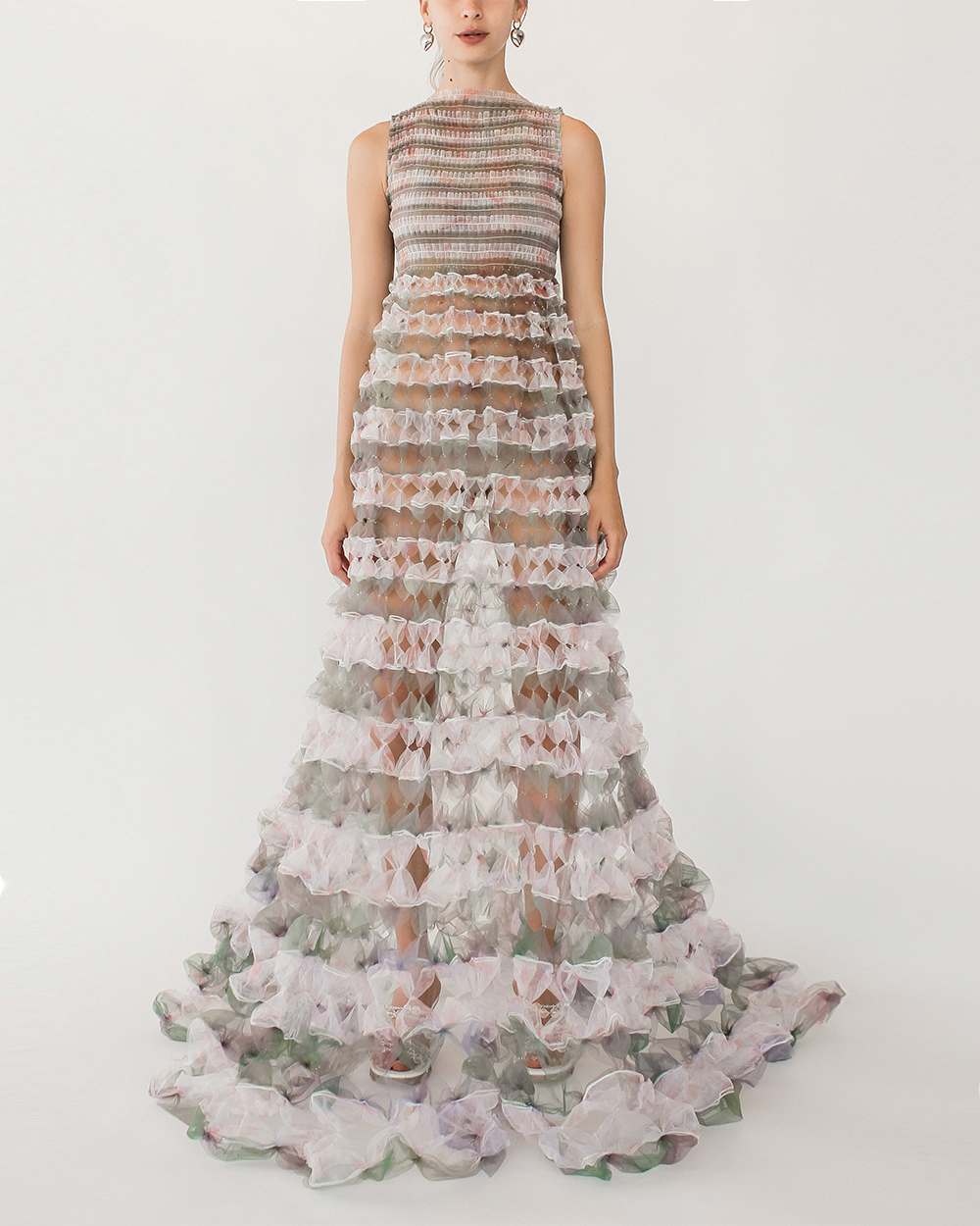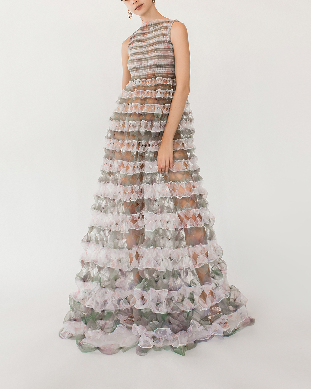 Our fit and flare dress is shirred in the bodice seamed with contrasting tulle stripes. The skirt is created using the Air-Ribbon technique and is in a flattering A-line shape.