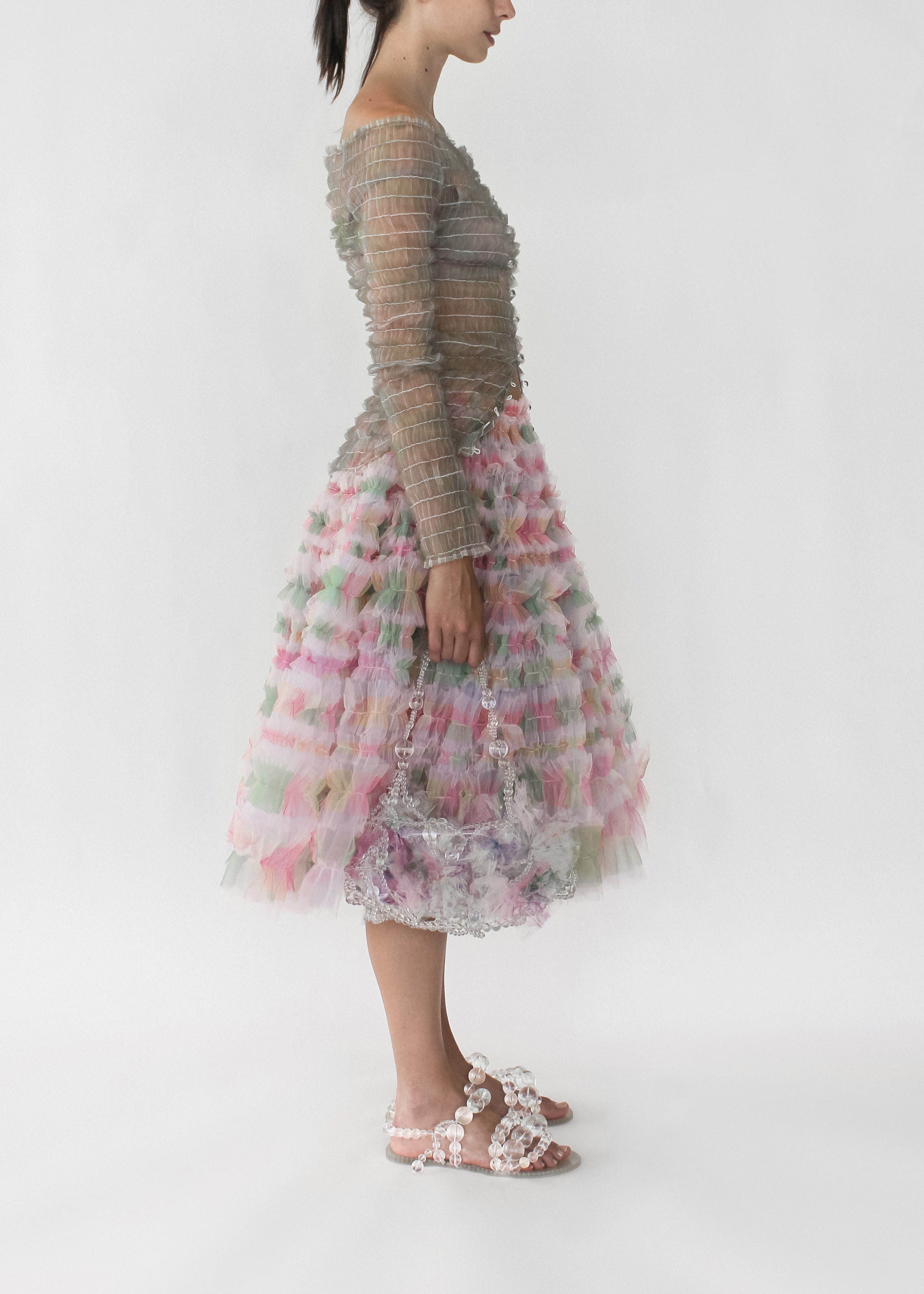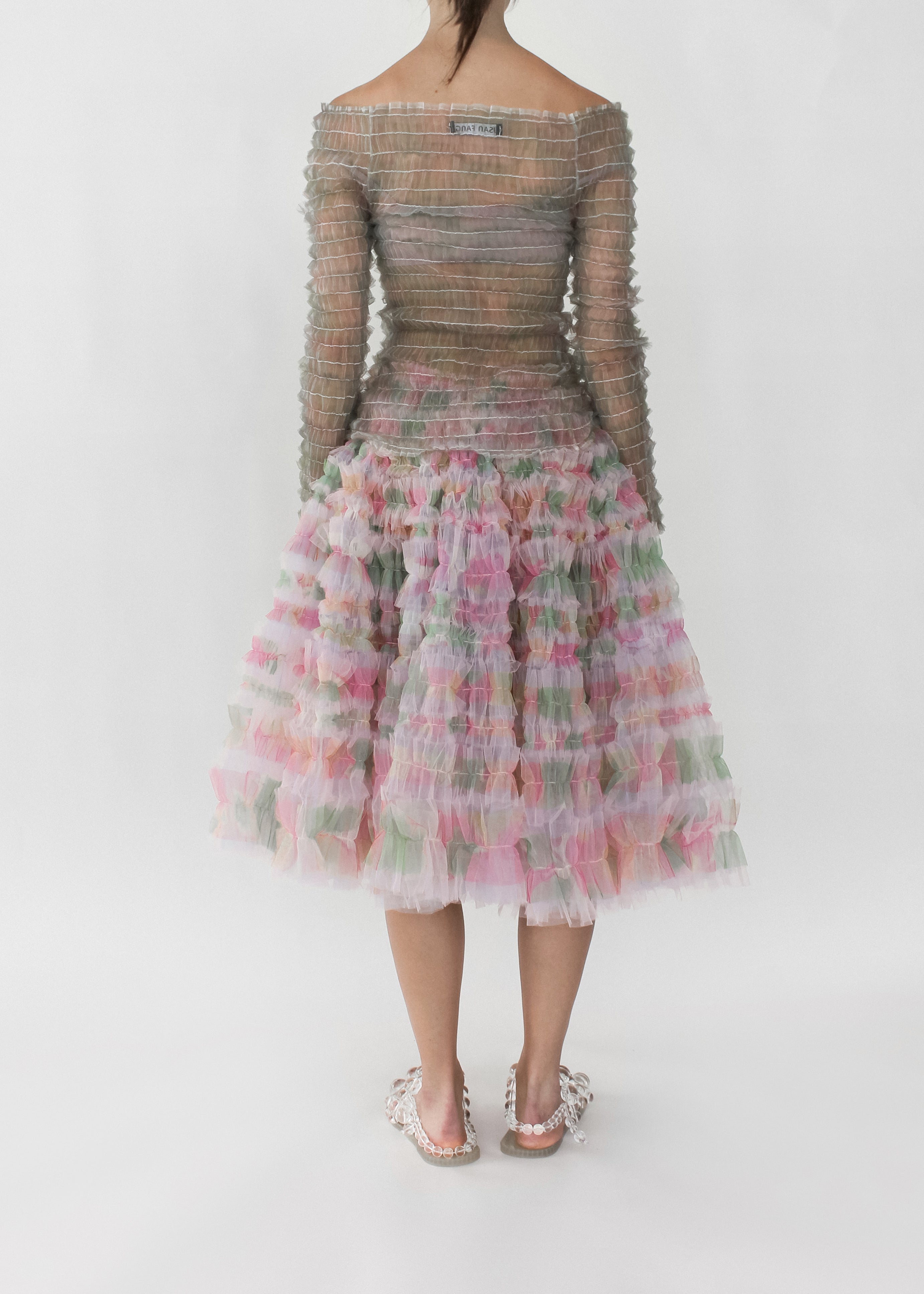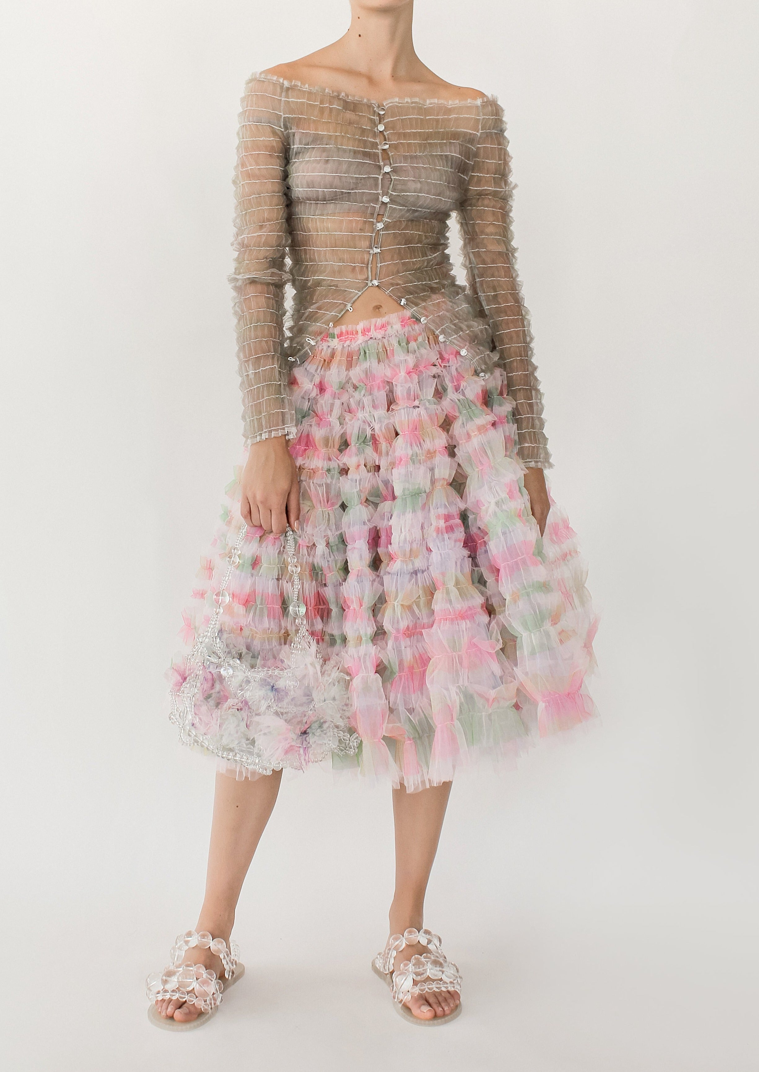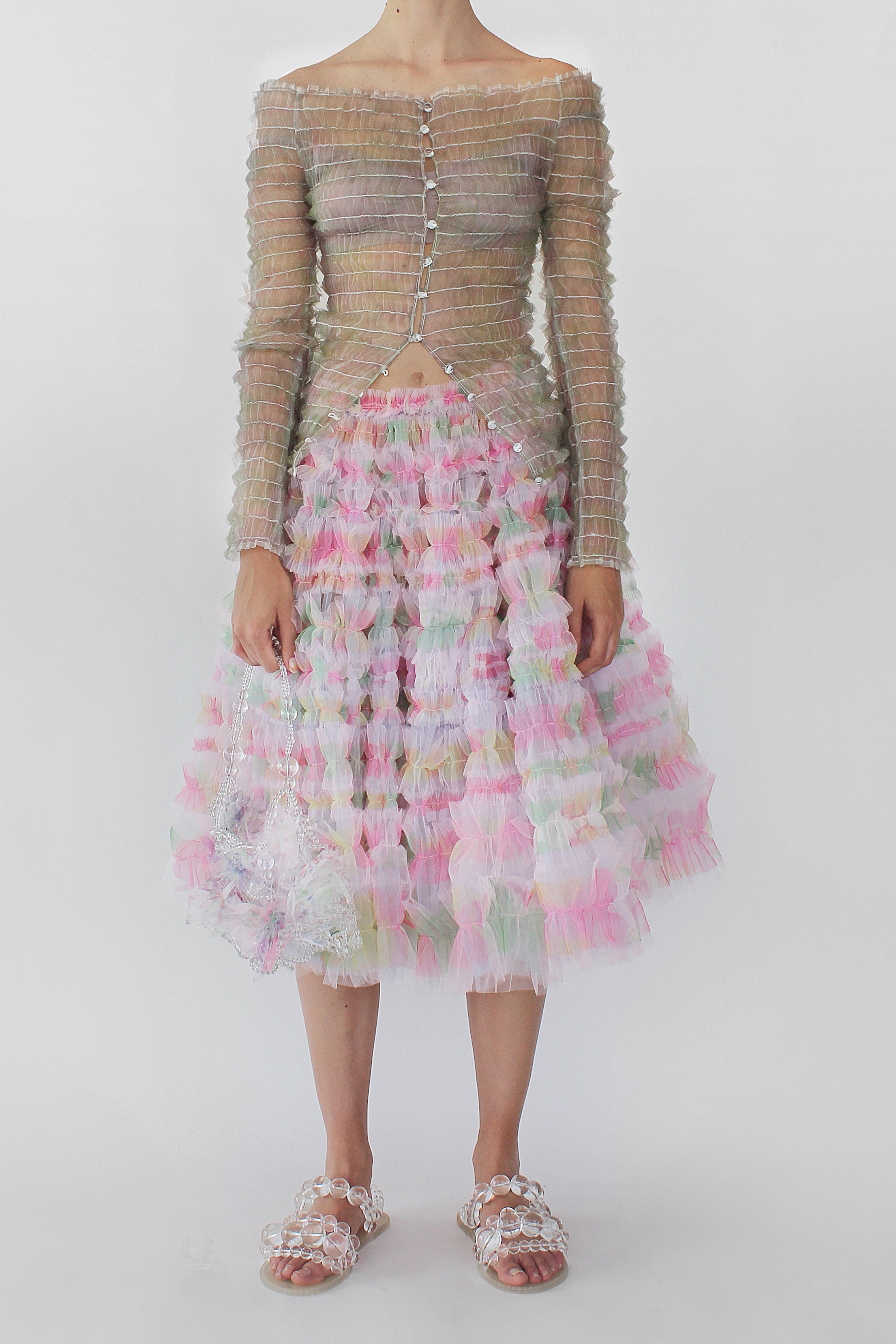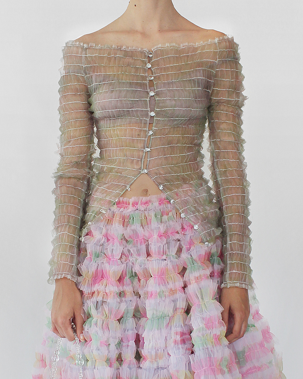 This off shoulder cardigan features frills and smock detailing all across the bodice and sleeves. It is also shirred along the bodice for a fitted yet flexible fitting
