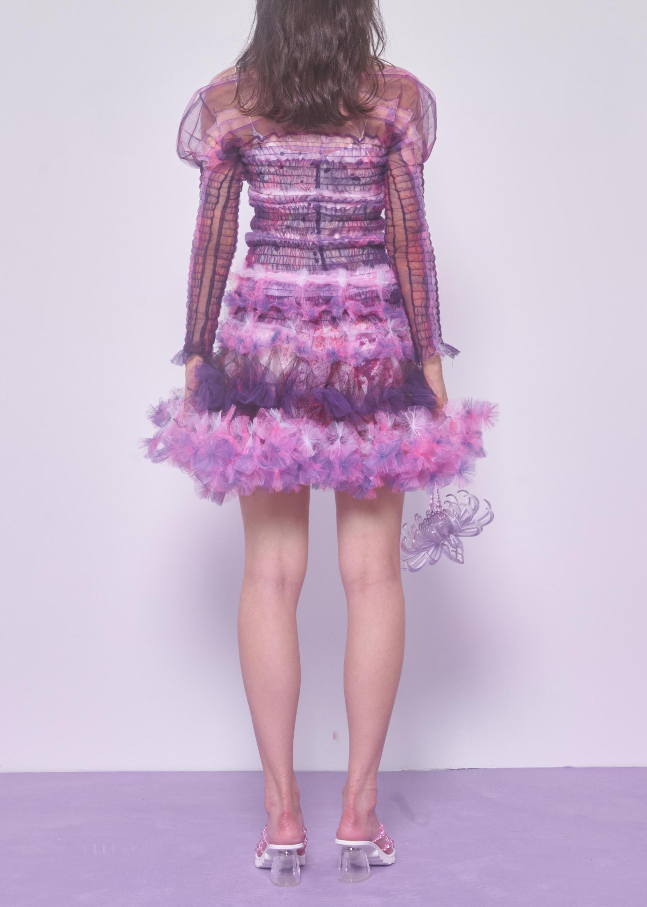 Our shirred dress features horizontal stripes and soft released drape at the top of the bodice. Full lengths sleeves are added for coverage and dress length sits above the knee.