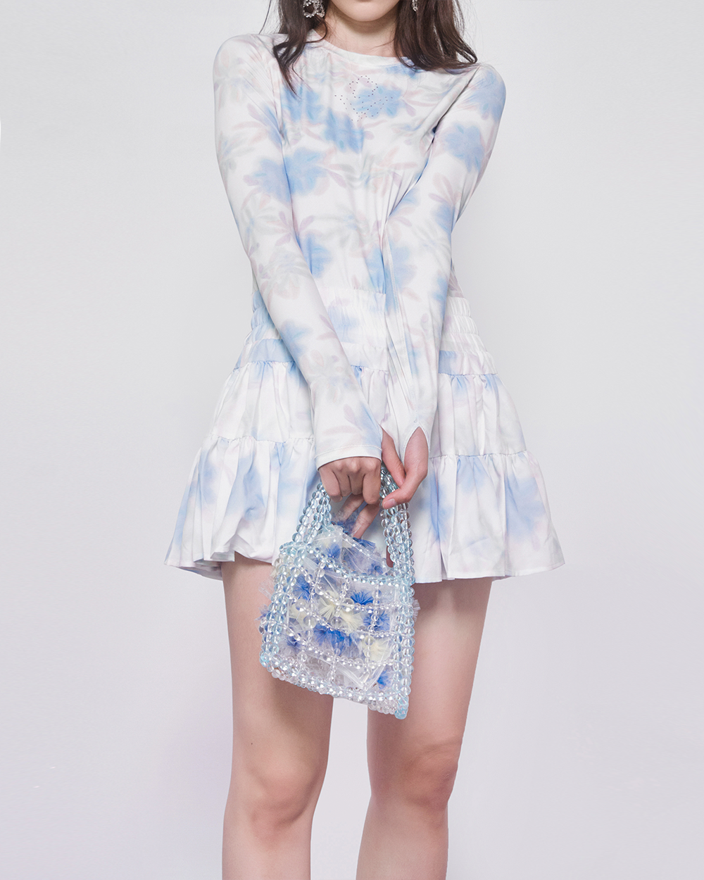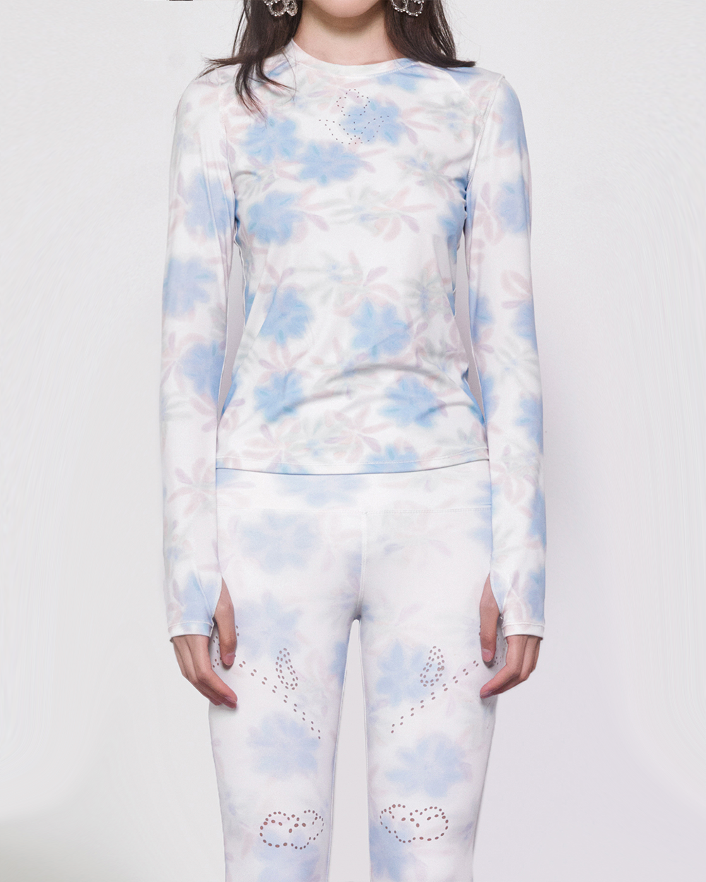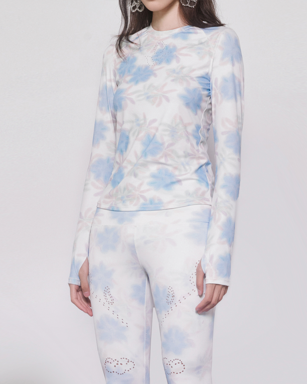 This top is part of our capsule sports collection. It is printed with a blue flower print and features a hole for the thumb at the sleeve hem as well as a laser cut flower detail on the chest.
