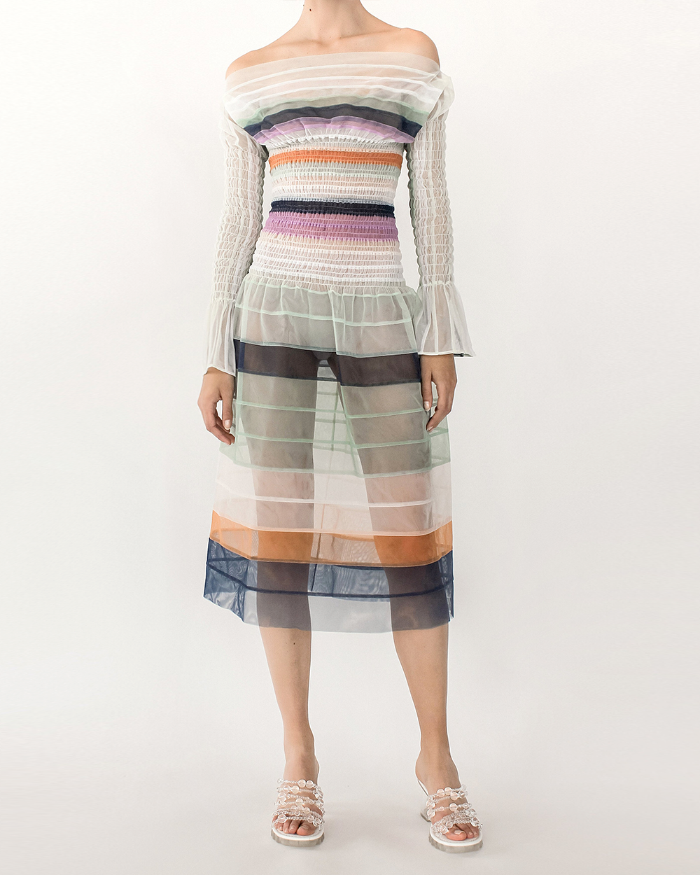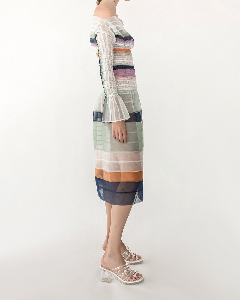 Our shirred dress features horizontal striped and soft released drape at the top of the bodice. Full lengths sleeves are added for coverage and dress length sits just right below knees